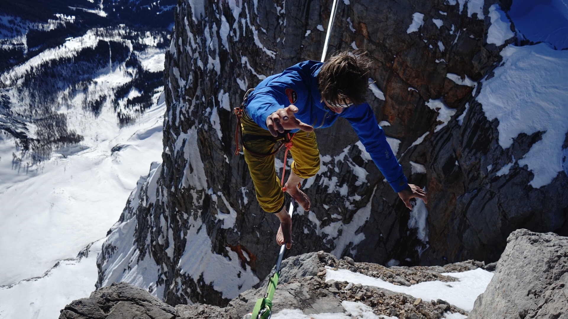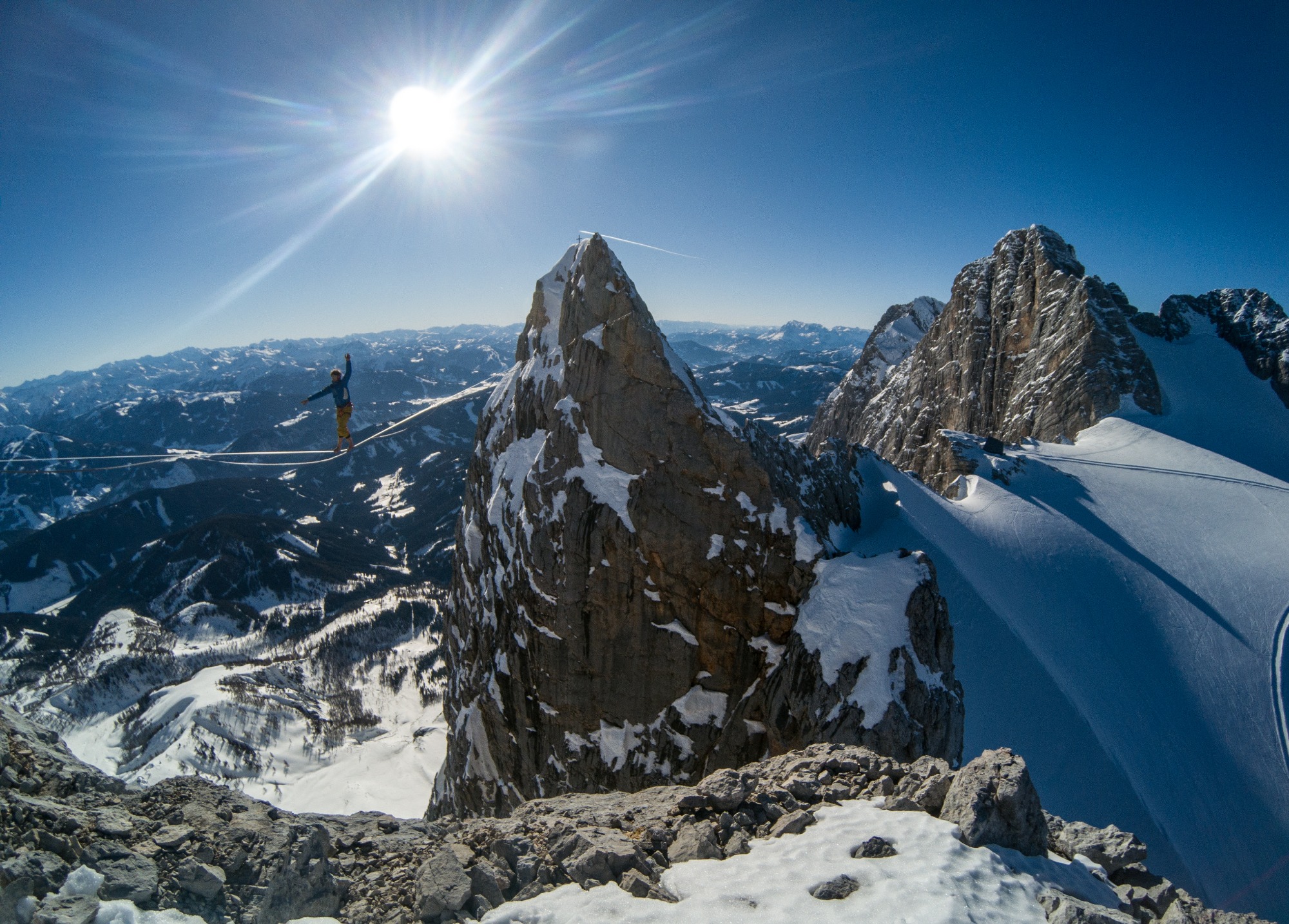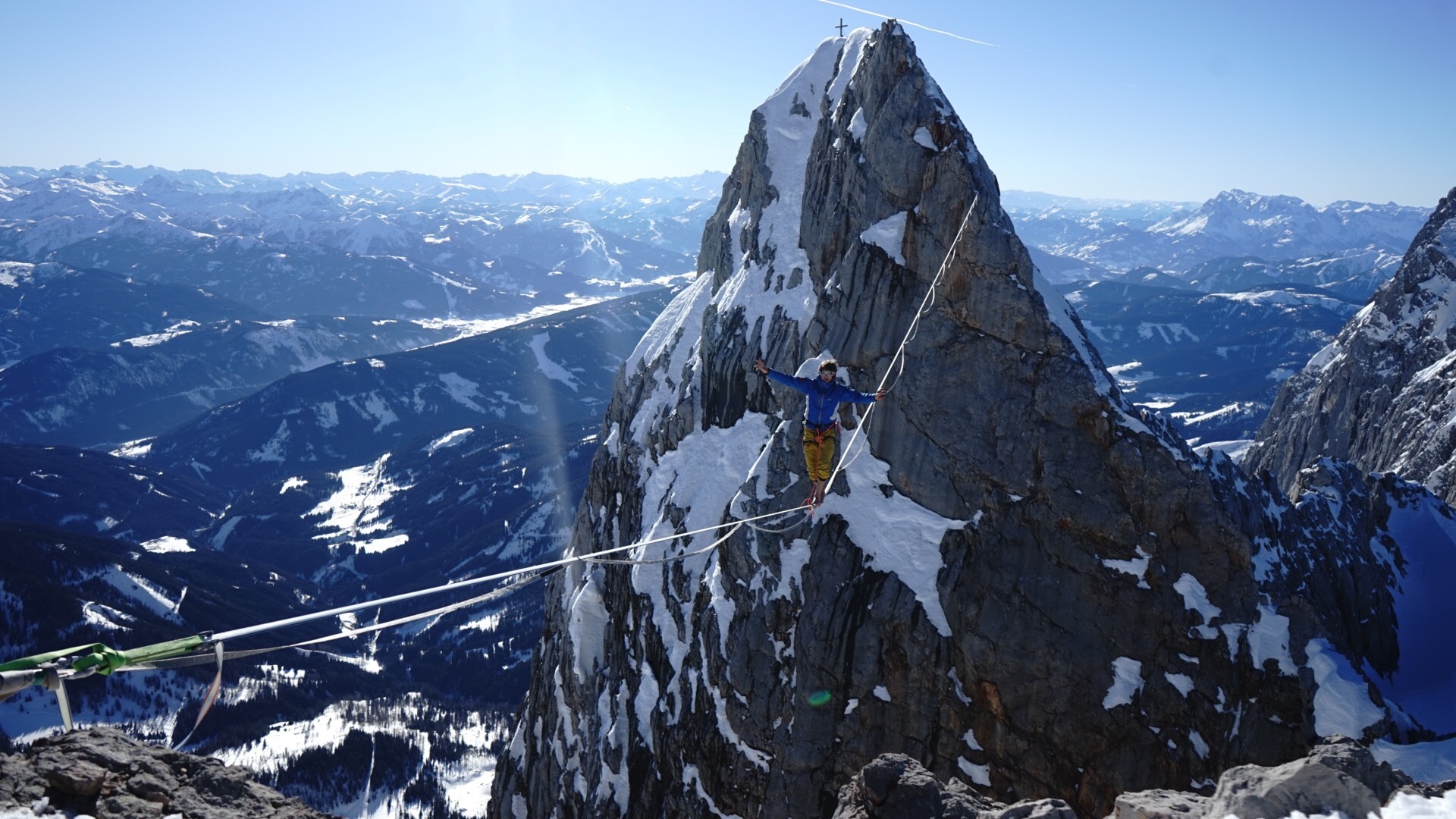 Rok se s rokem sešel a je tomu teda už rok, co se nám s Lukym Černým a Michalem Pírkem povedlo první opakování Dachsteinské highlajny mezi vrcholy Dirndlu. Velká obleva nás loni v únoru donutila vymyslet horský highline projekt, kde nás nebudou ohrožovat laviny z tepla a tohle místo k tomu bylo ideální. Jeden den jsme si s Lukym zavolali, že má být pár dnů v Alpách krásné a teplé počasí, během pár hodin vymysleli plán a obvolali kluky a druhý den jsme vyrazili. Všechno vyšlo perfektně. Krásné počasí, bezvětří, krásné lezení po hřebenu a úžasná exponovaná lajna s velkou šluchtou pod ní. Jeden den jsme vylezli nahoru a napnuli lajnu a druhý den jsme jí pochodili a sbalili.