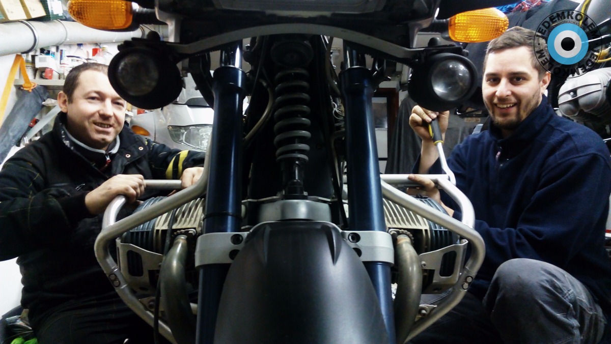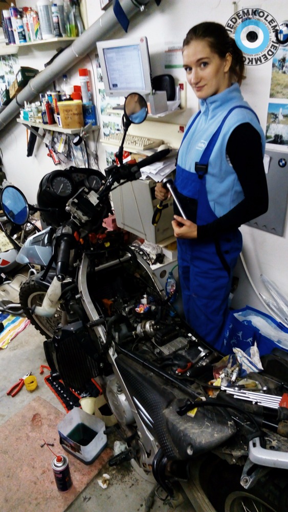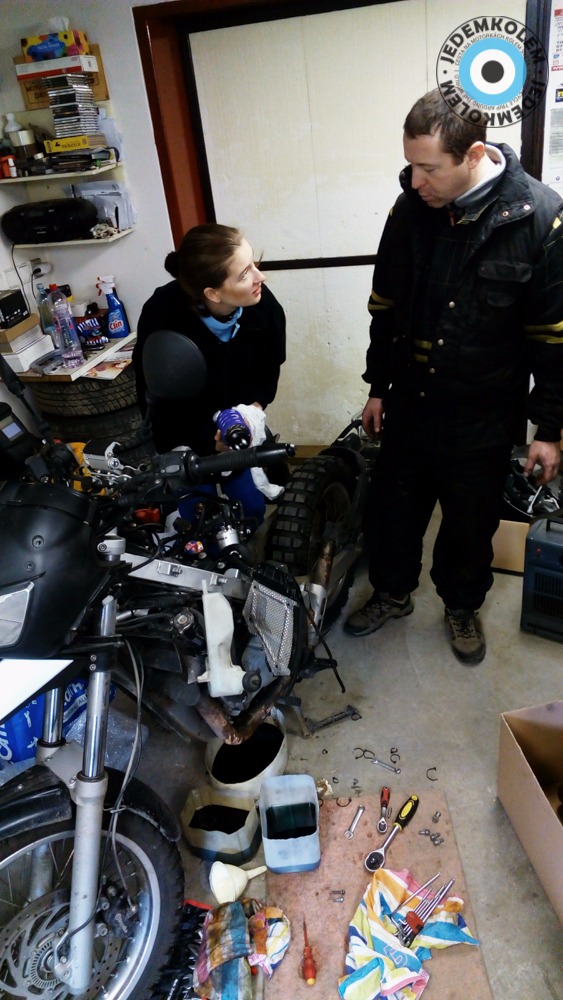 Na čtyři dlouhé víkendy se nás ujal kamarád Tonda. V garáži jsme pod jeho vedením motorky rozebrali, zkontrolovali. Co bylo třeba vyměnili a opět složili. Vše se podařilo a motorky napoprvé naskočily. Udělal se v podstatě jen běžný servis a kontrola všeho možného i nemožného. Motorky nemají najeto moc a měnit tak vše „preventivně“ nemá cenu. Při náloži kilometrů, která nás čeká, se stejně něco rozbije. S tím se musí počítat a proč teď měnit něco, co bude klidně sloužit celou cestu. Na čem že to vlastně jedeme? Oba na BMW. Vojta na R1150GS Adventure a Mirka na F650GS. Na Vojtové je ke všemu víceméně krásný přístup a tak se nejvíce času tráví s Mirčinou motorkou. Tady to místy připomíná opravu slovenského lakatoše. Kvůli jednomu šroubku musíš rozebrat celý traktor!! Co se týká „tuningu“, tak na motorkách pár doplňků je. Na obou je to hlavně hodně krytek na krytky, molitanové vzduchové filtry, zásuvky, navigace, přídavná světla, zvýšená řídítka a nosiče kufrů. Mirka má nová pevnější řídítka, jiný zadní tlumič, padací rámy, automatické mazání řetězu a 21“ přední kolo. Vojta si namontoval tobinátor na plexi a lepší pružiny. Proběhlo také zpevnění rámu z důvodu toho, že origo rám je měkký jak máslo. No a samozřejmě nejdůležitější na celé přípravě – samolepky.