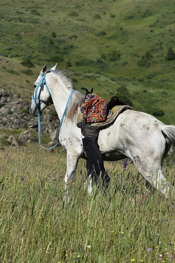 Cesta zpět do údolí řeky Aksu - Tiché zóny byla pro nás uzavřena. Zvolili jsme tedy variantu vybudování tábora na nedalekém náhorním platu. Cesta na koních netrvala dlouho. Když jsme překonali několik malých údolí a koně nás vyvezli do výšky cca 2300 m, otevřela se před námi nádherná horská louka s několika skalisky. Dalo se zde pohodlně schovat stany před větrem a vybudovat nový base camp. Poslední přijel Petr, byl na obhlídce okolí. Když se zvedl ve třmenech, aby přehodil nohu přes hřbet koně a sesedl, stalo se něco, co nečekal. Kůň vyrazil tryskem vpřed.