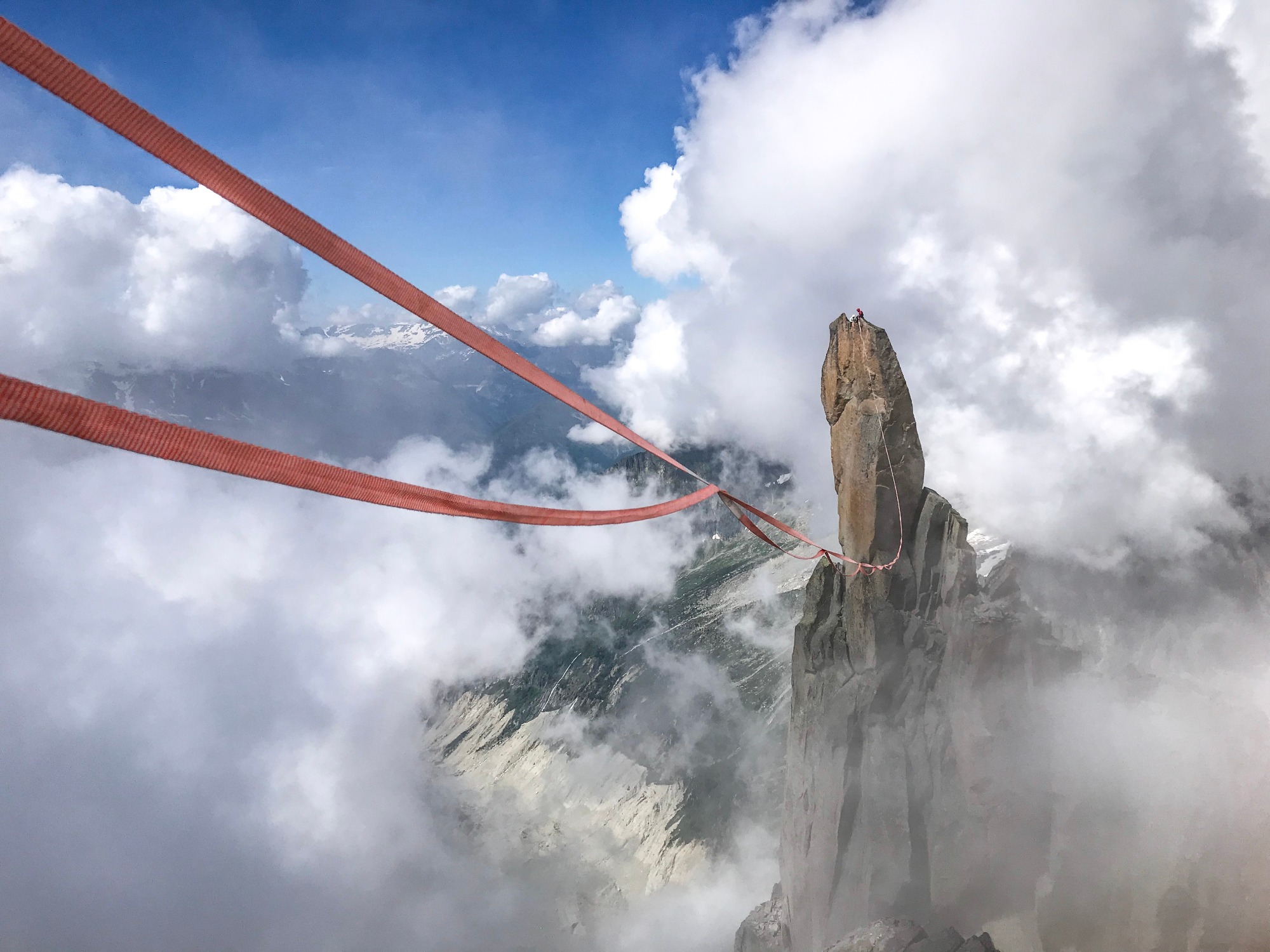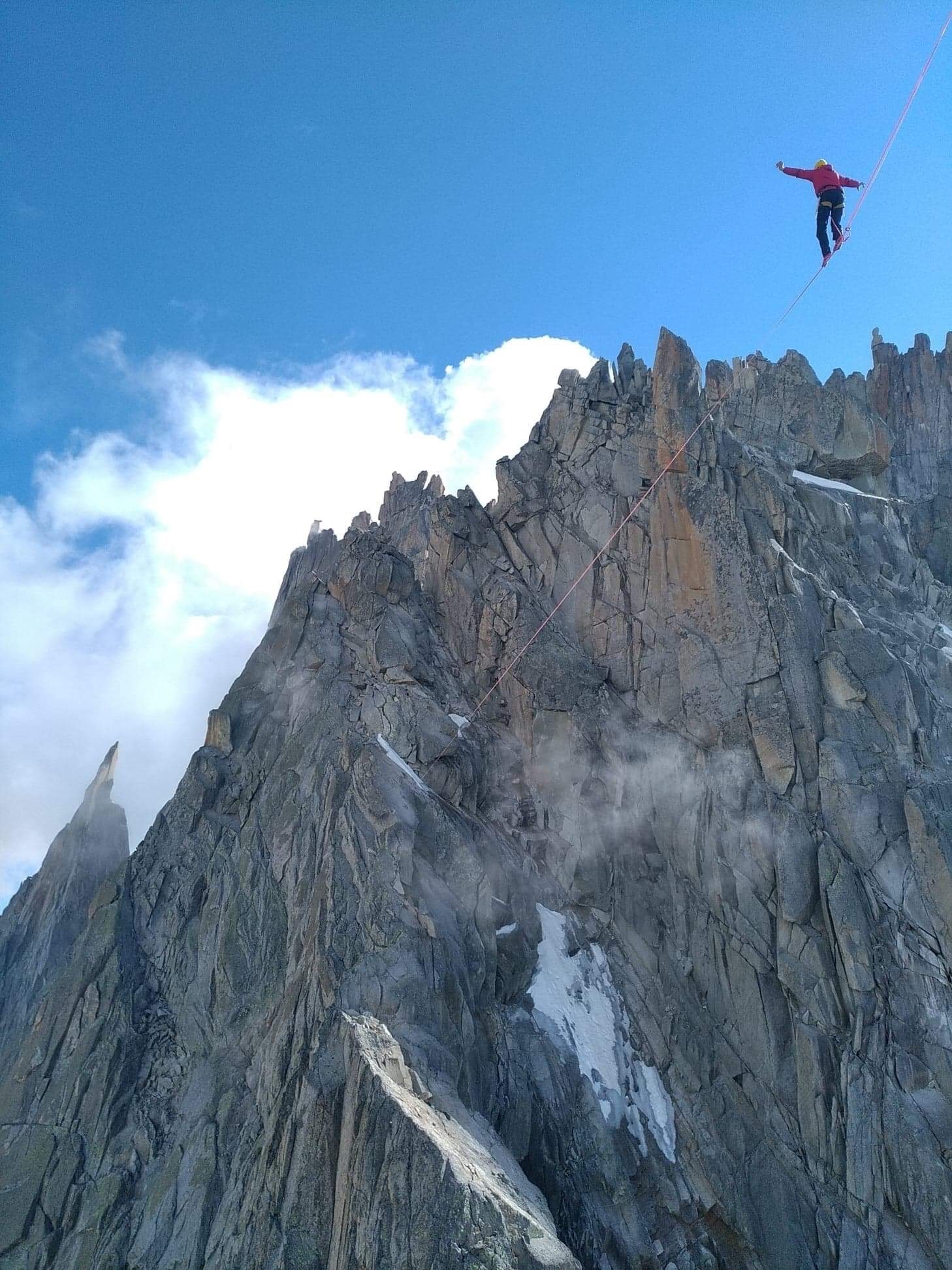 První den jsme vyjeli vláčkem na Montenvers a vyšli jsme na Refuge de l’Envers, kde jsme strávili celé odpoledne čekáním, až příjde a odezní hlášená bouřka. A jak psali, tak se stalo. Okolo 19. hodiny bouřka skončila a začalo odtikávat naše dvoudenní okno. Ještě ten večer jsme překonali sněhový odtrh na nástupu normálky na Republiku (Voie normale - 700m, 5c A0) a vylezli jsme pár prvních délek až k prostorné polici, kde jsme zalehli. Druhý den ráno budíček ve 4h a cca v 9h jsme byli v sedle pod Republikou. Odtud jsme lezli s Polem tři délky na stranu Charmozu a on pak slanil zpět do sedla a poté vylezl s Chloe na Republiku. Ťuk, ťuk, ťuk a takhle s kladivem a ruční vrtačkou asi hodinku, až jsme osadili tři nýty na kotvení na Charmozu a dva na Republice. Potom jsem vzlétl s dronem, abych poslal vlasec na druhou stranu. Po něm jsme přetáhli 4mm repku a potom už lajnu. V 16h byla tahle 100m dlouhá kráska napnutá a připravená. Obří mraky převalující se z hřebene na hřeben nám dělaly příjemnou magickou společnost, ale občas nás objaly tak silně, že nebylo vidět na víc jak pár metrů. Celý vzrušený jsem tak čekal až se na chvilku mraky rozestoupí a vytvoří mi zářivé okno, abych mohl lajnu přejít. Prosba byla vyslyšena. Mraky se rozestoupily a já už zas seděl na tom špagátě. Cítil jsem se strašně maličký v moři mraků, žuly a vzduchu a zase jsem se jednou bál jak malej kluk. Nádech, výdech, zved a už jsem na ní stál. Kolena se mi klepala a druhá strana mi připadala nejmíň kilometr daleko. Ale řekl jsem si, že z logiky věci, když budu dávat nohu před nohu, tak tam jednou přece dojít musím. A taky že jo! Za nějakou dobu jsem se probudil z tranzu, srdce bušilo jak kopák na bicích a já byl na druhé straně unavený, ale ohromně šťastný. Tímto se lajna oficiálně otevřela. Normálně se na 100 metrové highlajně ani moc nezapotím, ale tahle mi dala zabrat. Všechna ta dřina se sem vyškrábat s matrošem, udělat ručně kotvení, napnout to a to všechno v exponovaném prostředí vysokých hor dodává téhle lajně na obtížnosti, ale hlavně na kráse a přitažlivosti. Lajna dostala jméno ,,Érection celéste”.