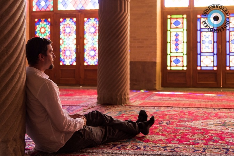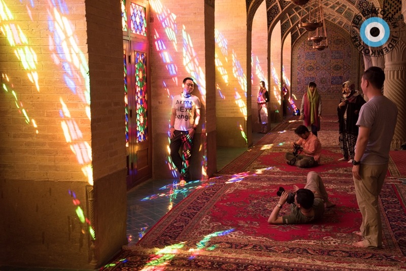 Ráno si přivstaneme a jedeme do další mešity, nyní Nasir Al Mulk. Tato je ovšem zajímavá svými barevnými vitrážemi, kterými ráno prochází slunce a vytváří tak na podlaze a stěnách krásné obrazce. Mešita je ovšem tak populární, že to tu vypadá jak na srazu fotografů. Bohužel, tuto cenu platíte v Íránu na zajímavých místech jako všude jinde. Obzvlášť „pro nás otravnou“ je skupinka asi deseti Korejců, každý v ruce dva foťáky a pro jistotu i telefon. Jako byste stáli vedle šicího stroje, fotí se jak o život. Bohužel pro nás ostatní si tu udělali tábořiště a nehodlají se hnout z místa. Nad některými pózami se spolu s ostatními bavíme. Sedíme tedy chvíli jen tak v koutě, snažíme se ignorovat všechny zvuky a užíváme si atmosféru tohoto místa.