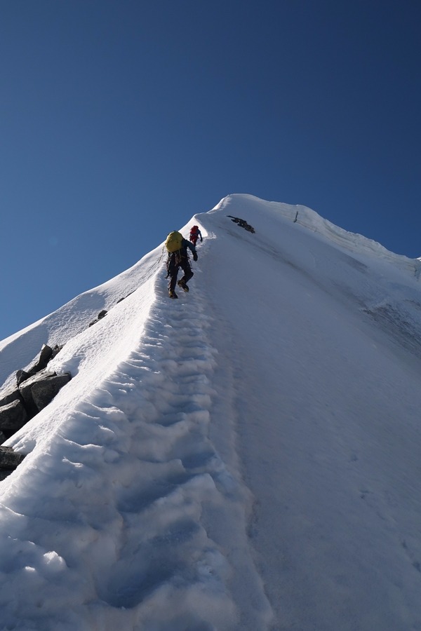 Východním pilířem (levým ze třech výrazných) vede klasická Kuffnerova cesta. V sobotu ráno o půl čtvrté odcházíme od stanu u chaty Diavolezza a o tři hodiny později stojíme na nástupu. Spodní část pilíře lezeme současně až pod klíčové místo klasifikace V. Po jeho překonání opět pokračujeme současně. Závěrečný firnový hřeben dáváme sólo. Po čtyřech hodinách lezení stojíme na východním vrcholu Piz Palu. Počasí skutečně krásné. Až moc. Na slunci je jak v peci. Už se těšíme na zasloužené pivko.