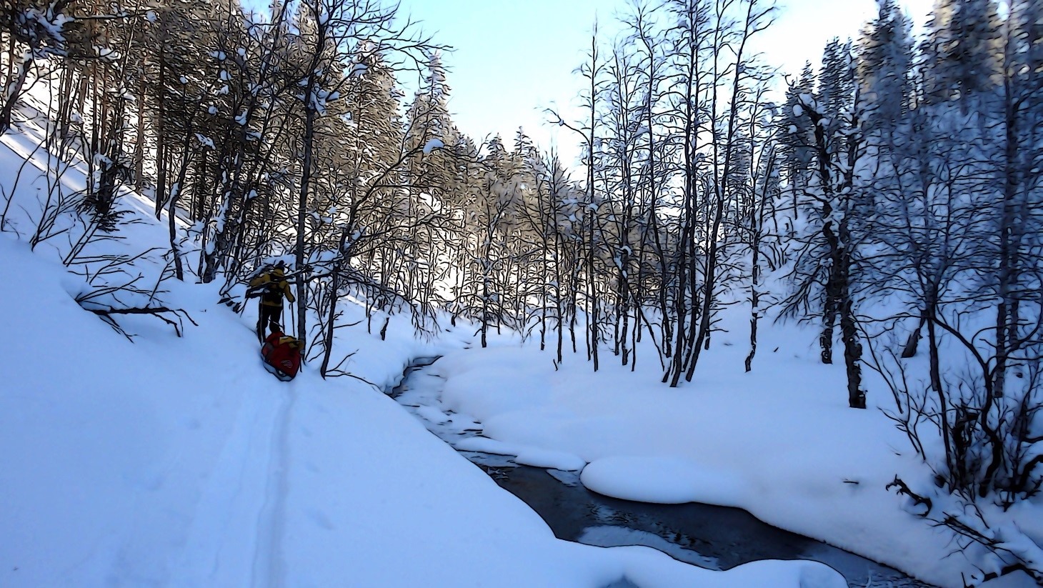 Zas ráno -35°C a nepříjemná ranní šeď, mlha, žádná cesta dál. Jeden na druhého raději nemluvíme, jsme oba psychicky vyčerpaní. Ještě horší ponorku pociťujeme ve chvíli, kdy se po hodině chůze musíme vrátit zpět do výchozího bodu a zvolit jinou cestu po druhé straně řeky. Skály, křoví a dnes již otevřená voda s peřejemi komplikují další postup.