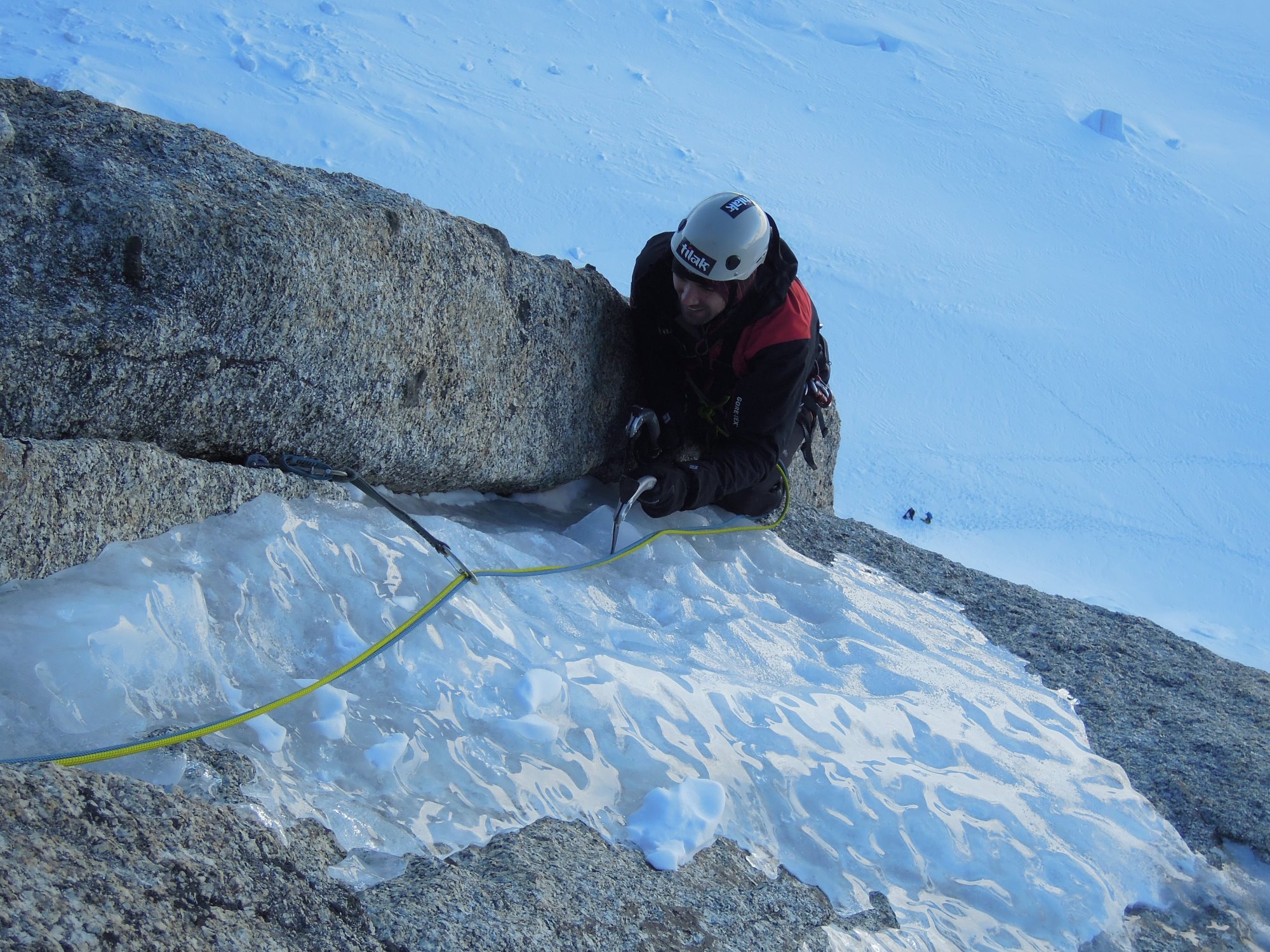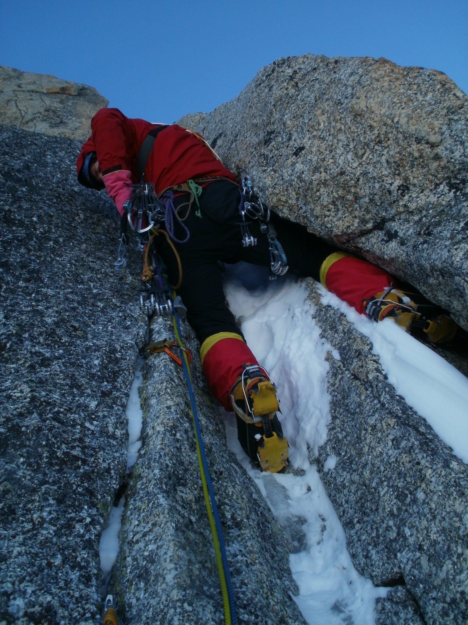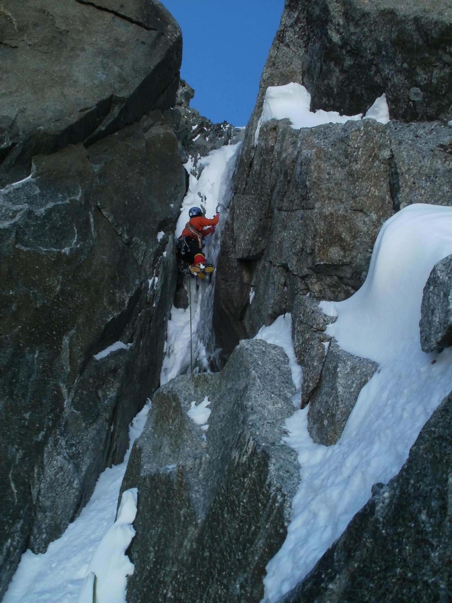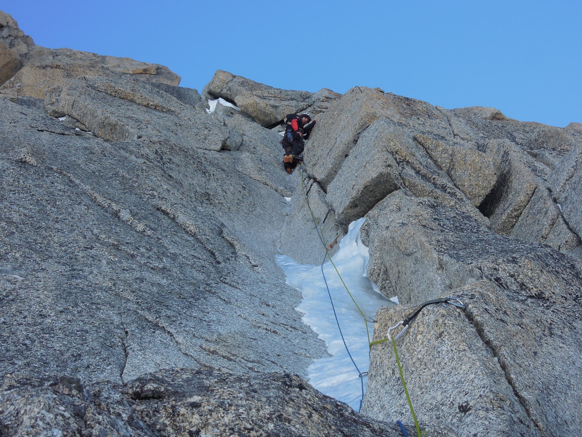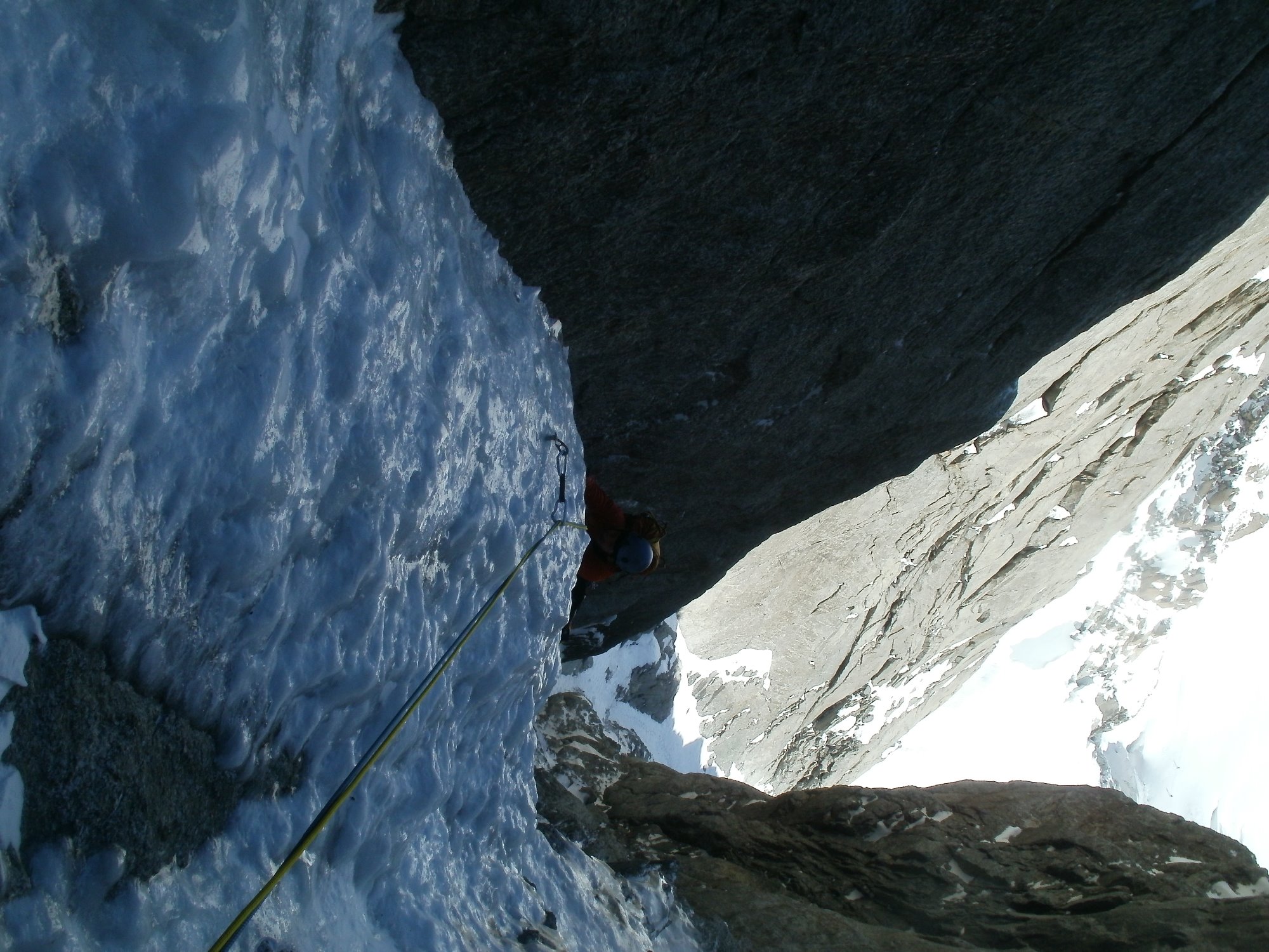 V sobotu vstáváme ve čtyři ráno. Vítr nám zafoukal včerejší stopy, takže zase prošlapáváme. Na nástupu začíná pomalu svítat. V první délce jsem nenašel štand, tak valíme současně. Trošku mě brzdí ledová stěnka s mixovým závěrem. Další čtyři délky vedou firnovým žlabem, část lezeme současně. Štandy už nacházíme. Na konci žlabu do nás už nemilosrdně pere sluníčko, tak jsme rádi, když se schováme v komíně. Z konce žlabu cesta pokračuje pěti délkami na vršek stěny. Jedná se převážně o ledové lezení.
