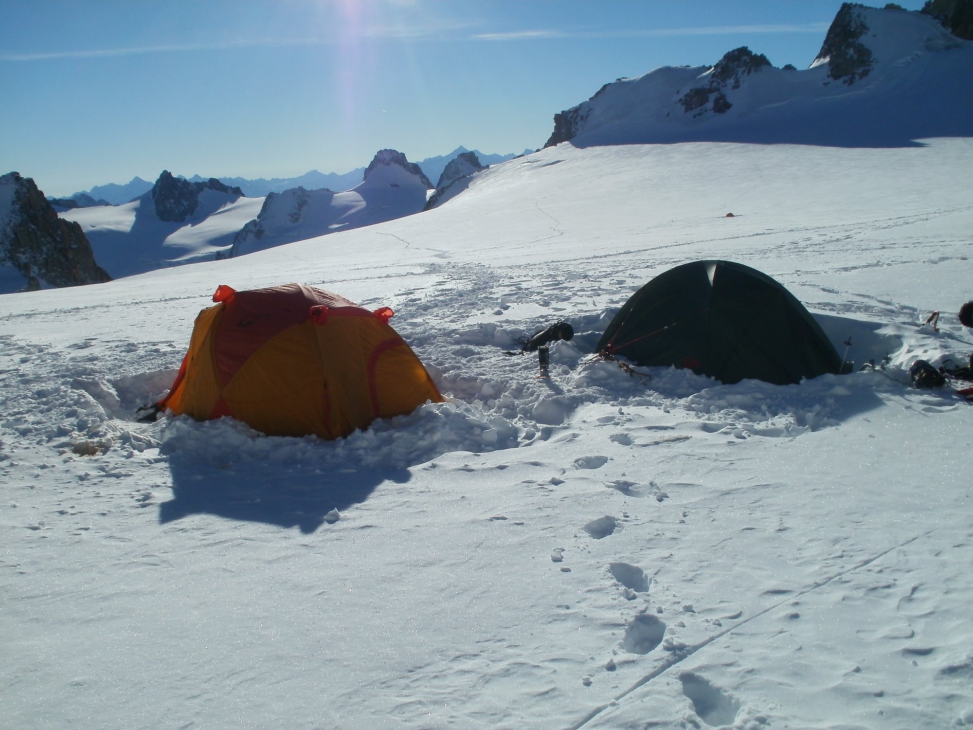 V pátek brzy ráno parkujeme naší dodávku v Chamonix u nádraží. Pár hodin spánku, zabalit krysy na pár dní a hurá na lanovku. Lanovkou na Midi jsem jel již po třetí, ale stále je to zážitek. Nahoře je opravdu azuro, jen trošku zima. Sestupujeme známou cestou po ostrém hřebínku na ledovec do sedla pod Midi, kde stavíme základní tábor.